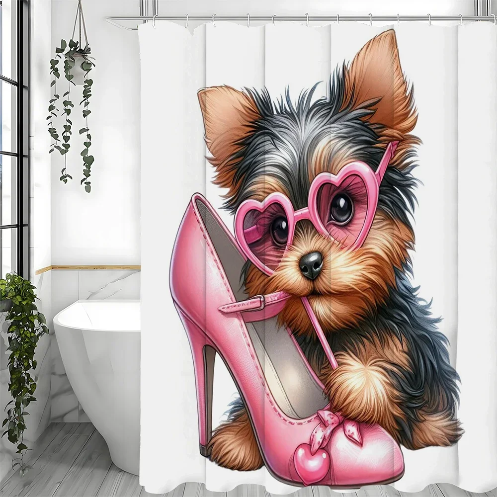 Cute Yorkie Dog Shower Curtain - Sunglasses & Pink Heels Design Waterproof Bathroom Decor